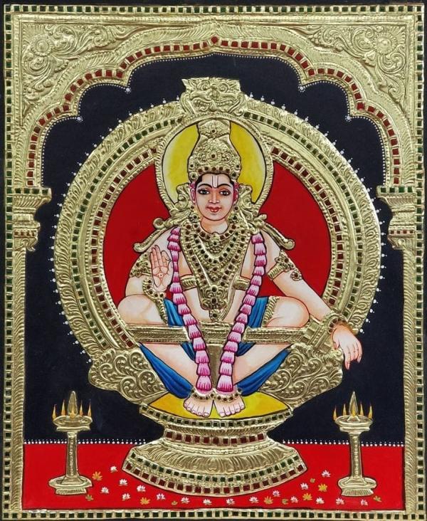 Ayyappan Tanjore paintings are revered devotional artworks that depict Lord Ayyappa, the beloved deity of Sabarimala, in the traditional South Indian Tanjore style.