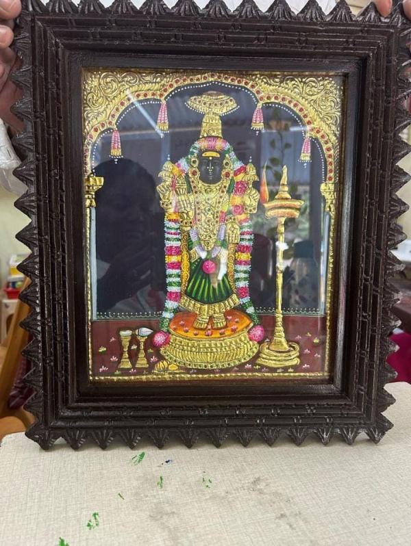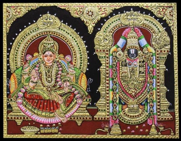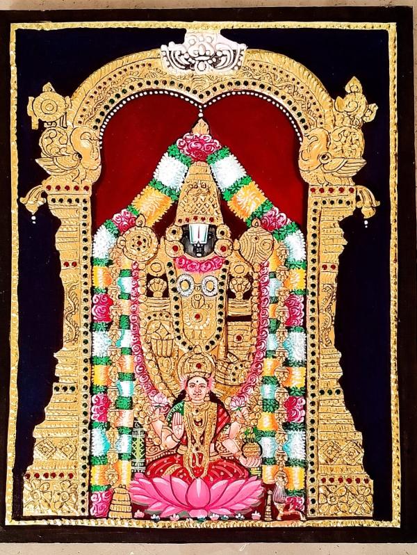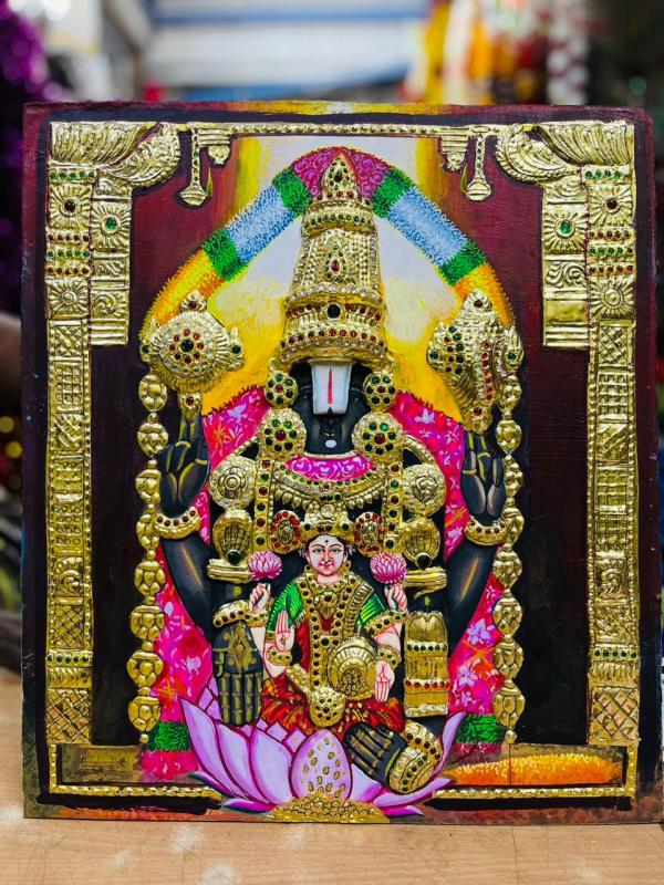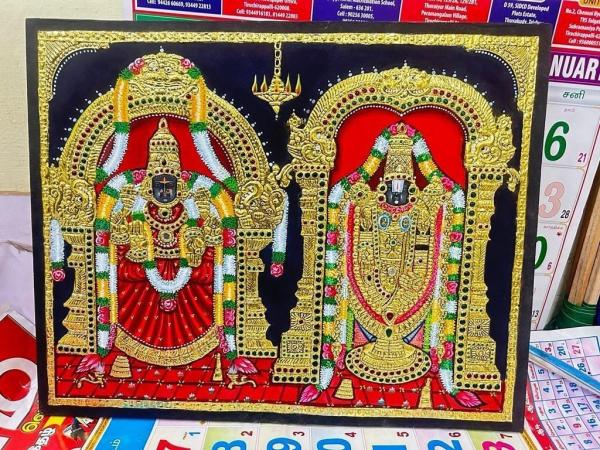 A Balaji Thayar Tanjore painting is a revered piece of South Indian devotional art that portrays Lord Venkateswara (Balaji) alongside his consort Goddess Alamelu Mangai (Thayar).