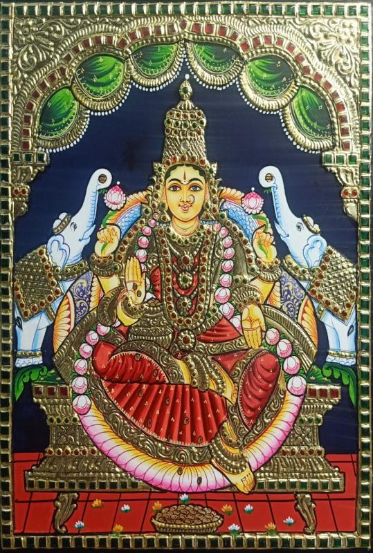 Gajalakshmi Tanjore paintings are exquisite depictions of Goddess Lakshmi in her Gajalakshmi form, symbolizing prosperity, wealth, and abundance. Crafted using traditional techniques.