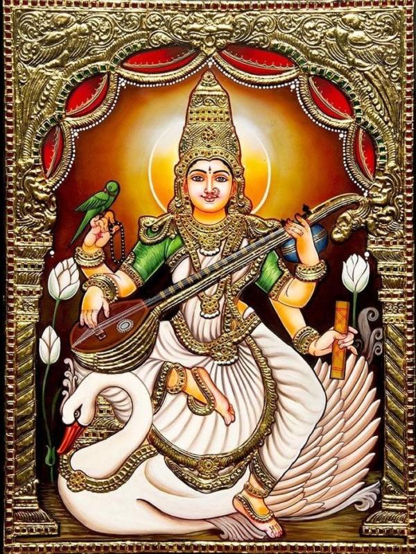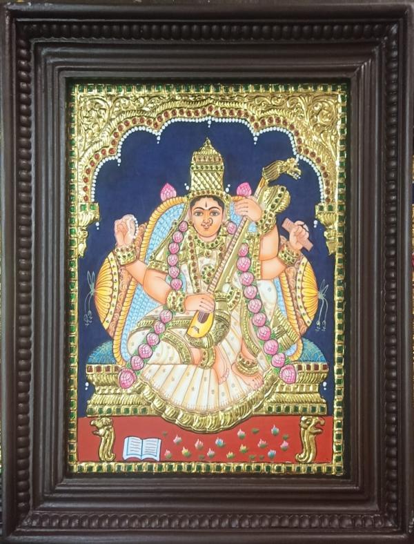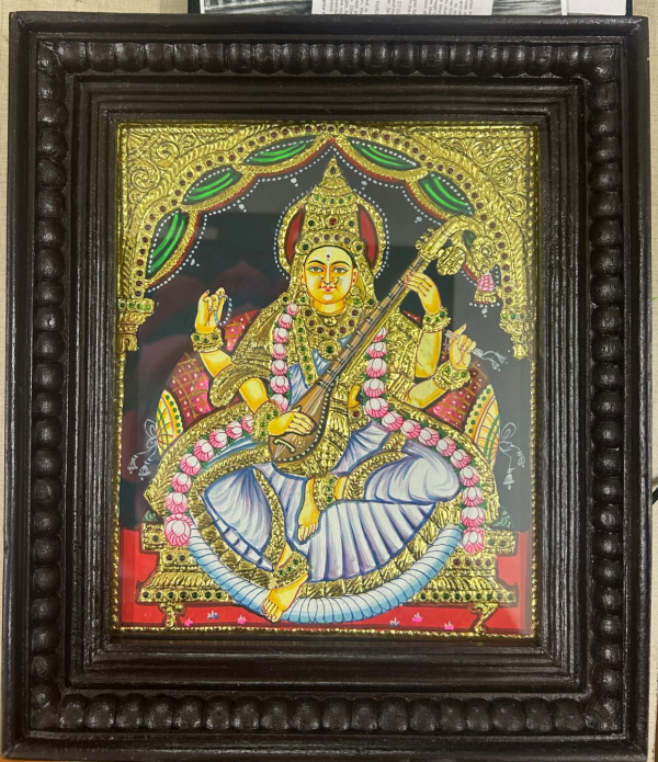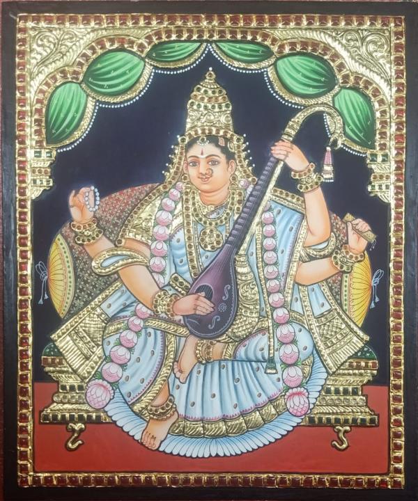 A Saraswati Tanjore painting is a revered piece of South Indian devotional art that portrays Goddess Saraswati, the deity of wisdom, learning, music, and arts.