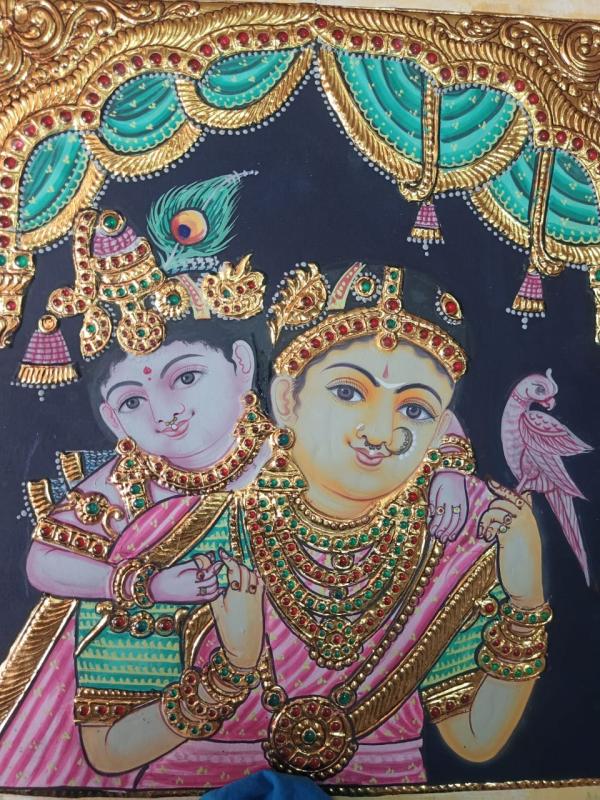 Radha and Krishna are often depicted in Tanjore paintings,symbolizing divine love and devotion.These paintings capture moments from their relationship,such as their playful interactions and spiritual