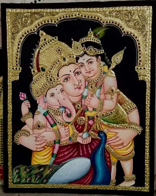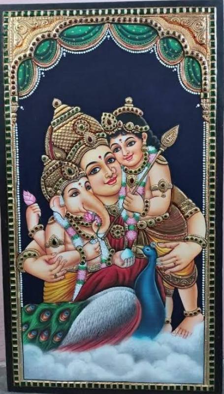 A Shiva Family Tanjore painting is a revered piece of South Indian devotional art depicting the divine family.