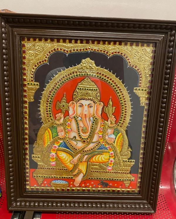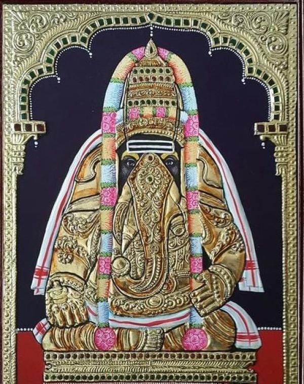 A Vinayagar Tanjore painting is a revered South Indian devotional artwork depicting Lord Ganesha, also known as Vinayagar, the deity of wisdom, prosperity, and remover of obstacles.