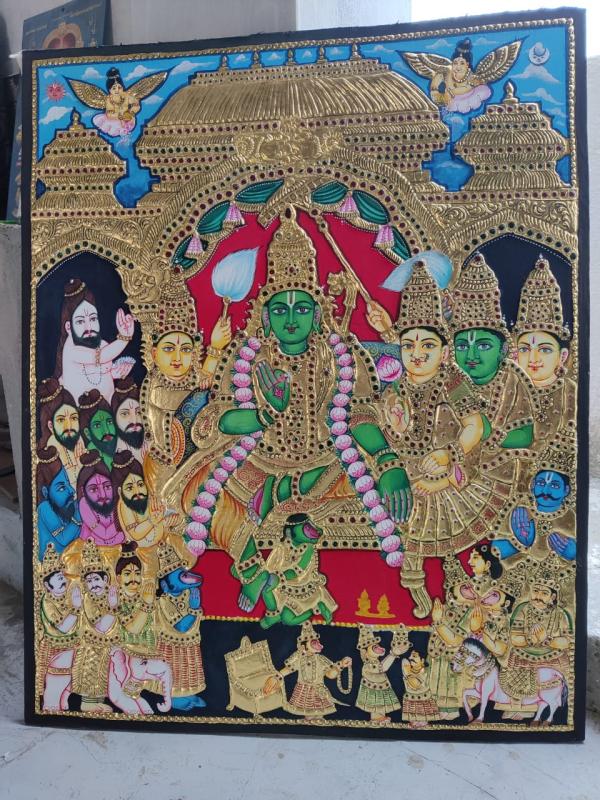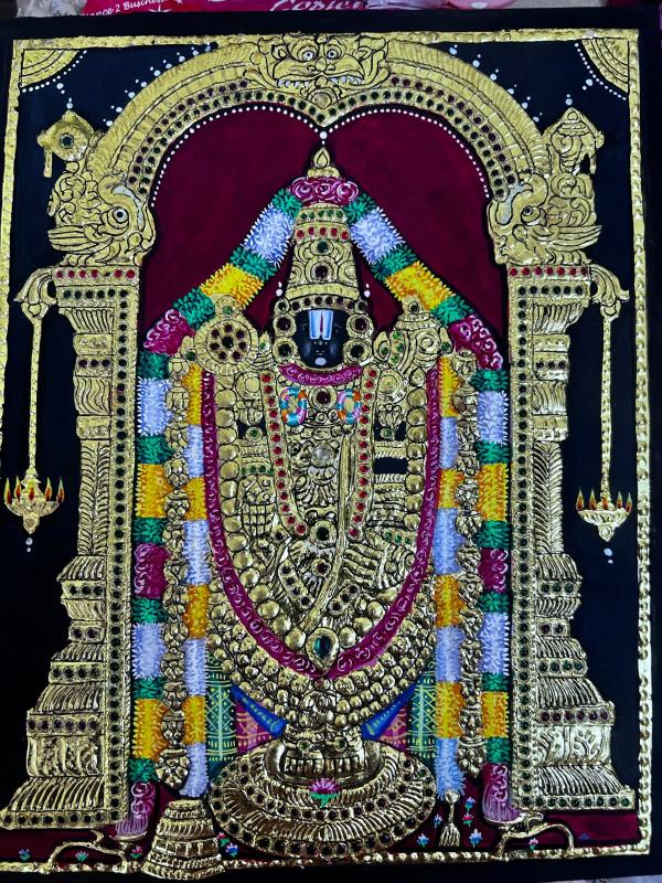Tanjore paintings of Lord Venkateshwara, also known as Balaji, are exquisite representations of the Hindu deity, revered for his benevolence and grace.