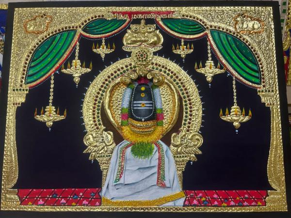 A Thiruvannamalai Tanjore painting is a traditional South Indian artwork that depicts the revered deities of the Arunachaleswarar Temple in Thiruvannamalai.