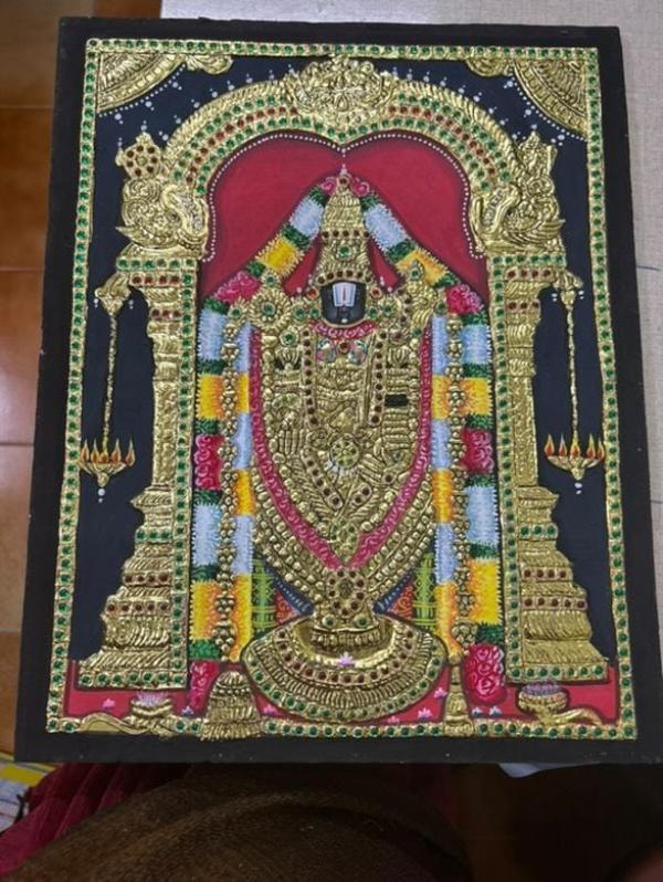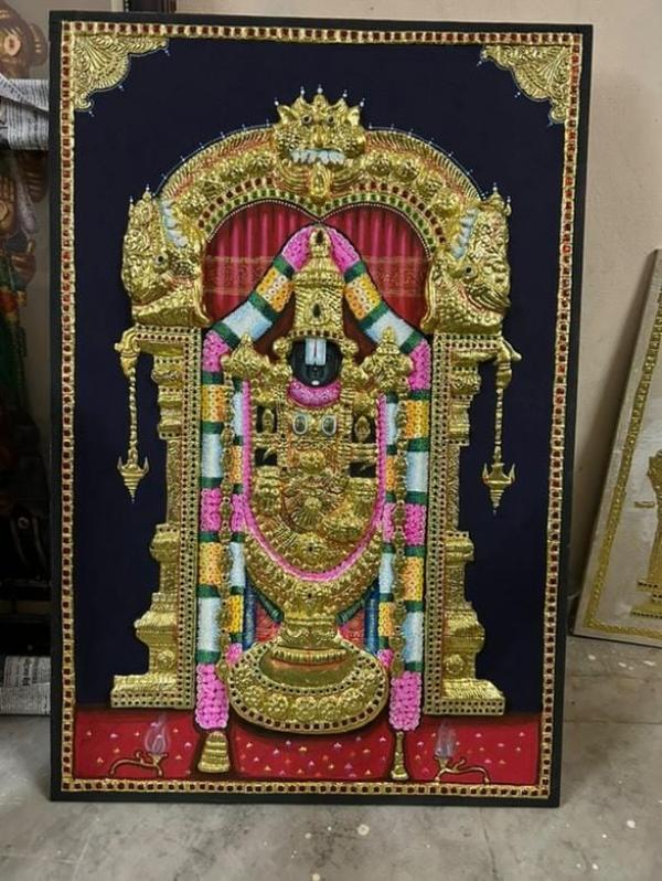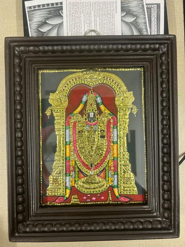 A Balaji Tanjore painting portrays Lord Venkateswara, an incarnation of Lord Vishnu, revered primarily at the Tirupati temple.
