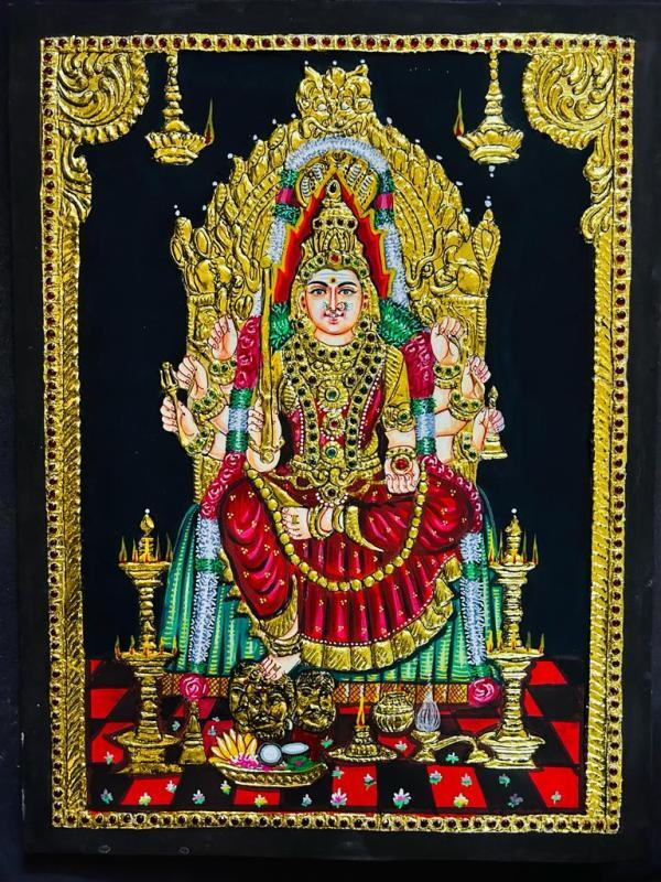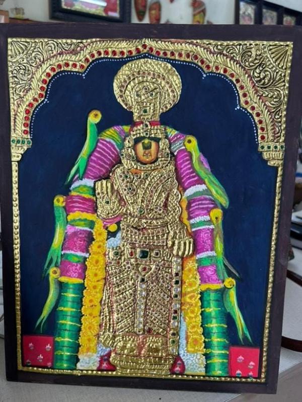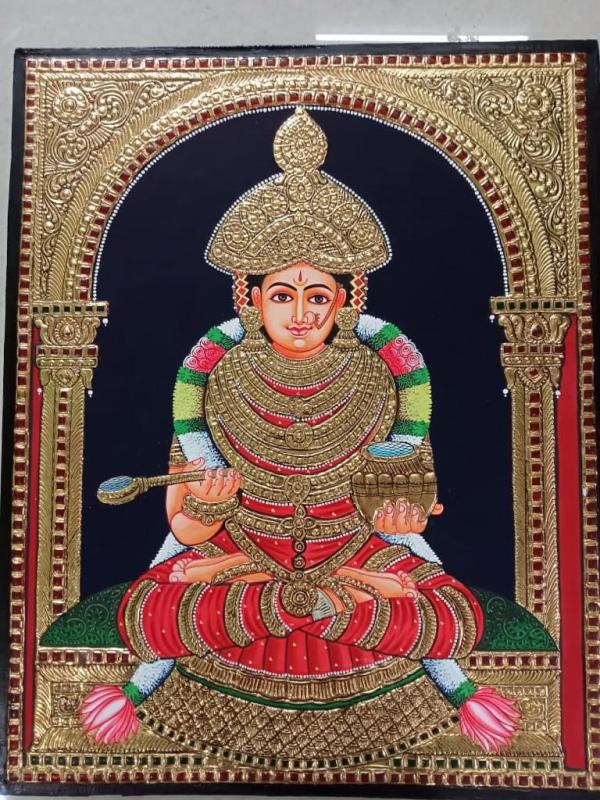 A Goddess Akilandeshwari Tanjore painting is a revered piece of South Indian devotional art depicting Goddess Akilandeshwari, a powerful form of Parvati worshipped as the supreme universal mother.