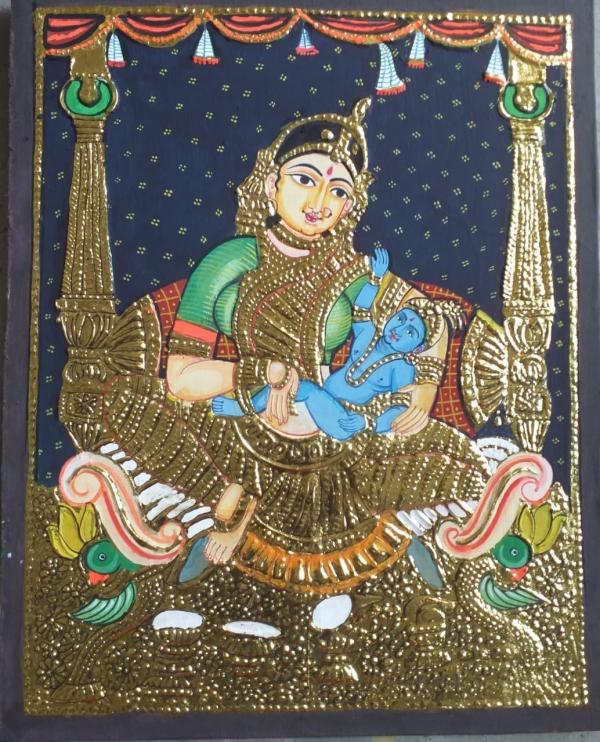 The paintings typically depict Yashoda, the foster mother of Lord Krishna, lovingly embracing or feeding the infant Krishna.